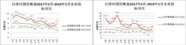 (二)白塔河國控?cái)嗝?018年5月---2019年5月主要水質(zhì)指標(biāo)溶解氧均值:6.36 mg/L,氨氮均值:0.96mg/L,總磷均值:0.16mg/L,高錳酸鹽指數(shù)均值:5.56 mg/L,COD均值:16.23 mg/L,水質(zhì)主要指標(biāo)均值同樣全部達(dá)到地表水Ⅲ類水質(zhì)標(biāo)準(zhǔn)。由數(shù)據(jù)可證:在工程治理期間白塔河水體水質(zhì)較往年得到了很大的改善,水體自凈能力不斷提高,抗風(fēng)險(xiǎn)能力增強(qiáng)。